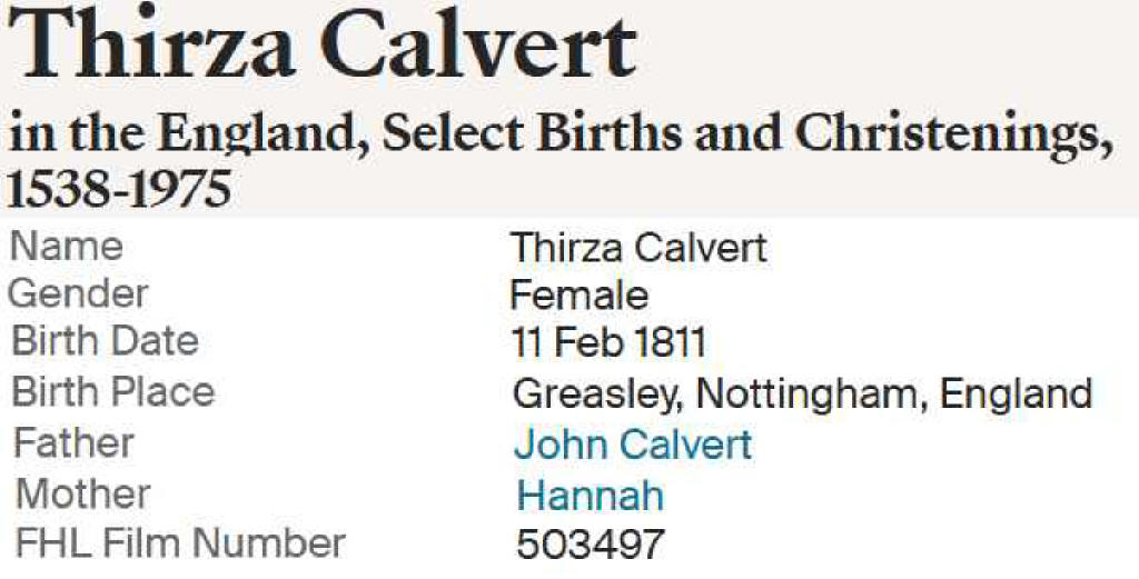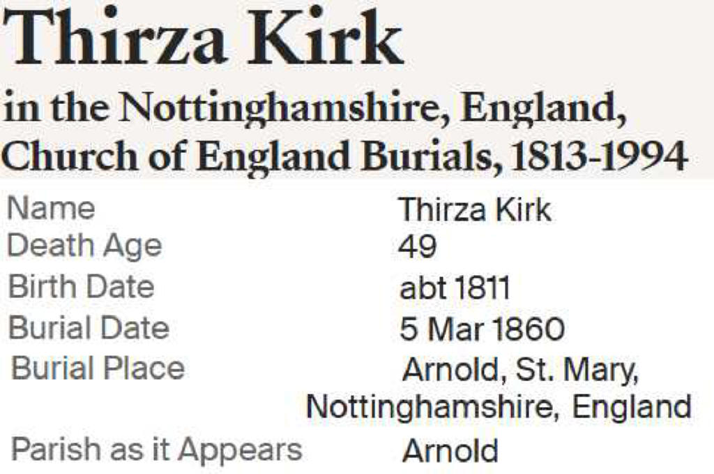 | Thirza Calvert | 11 Feb 1811 | 5 Mar 1860 | Edward Kirk, | |