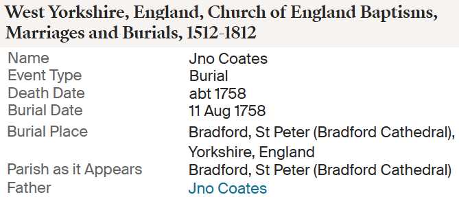 | John Coates | 1743 | Hotham, Yorkshire, England | ||